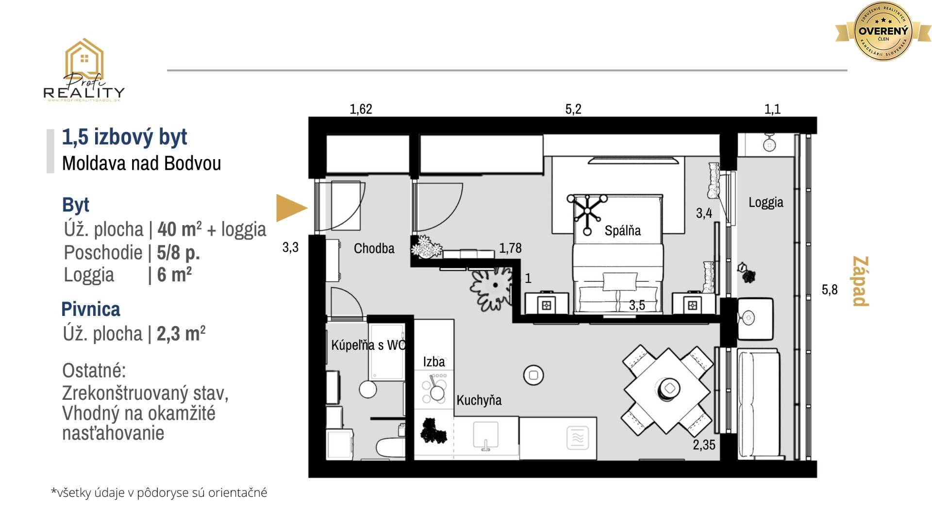 PROFI REALITY SABOL exkluzívne ponúka na predaj 1,5 izbový byt s rozlohou 40 m² plus pivnica 2,3 m² a loggia 6 m² v Moldave nad Bodvou.
