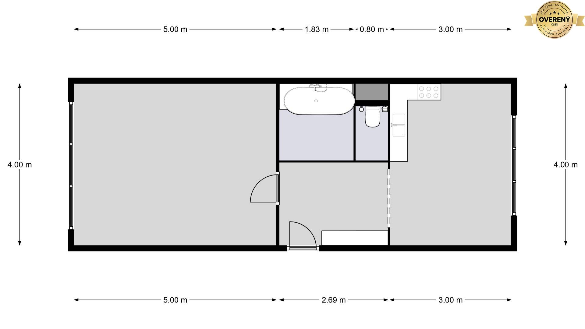 • Tento typ bytu je možné prerobiť na 2 izbový (kuchyňu transformovať na spálňu a kuch. linku umiestniť v rohu obývacej miestnosti)