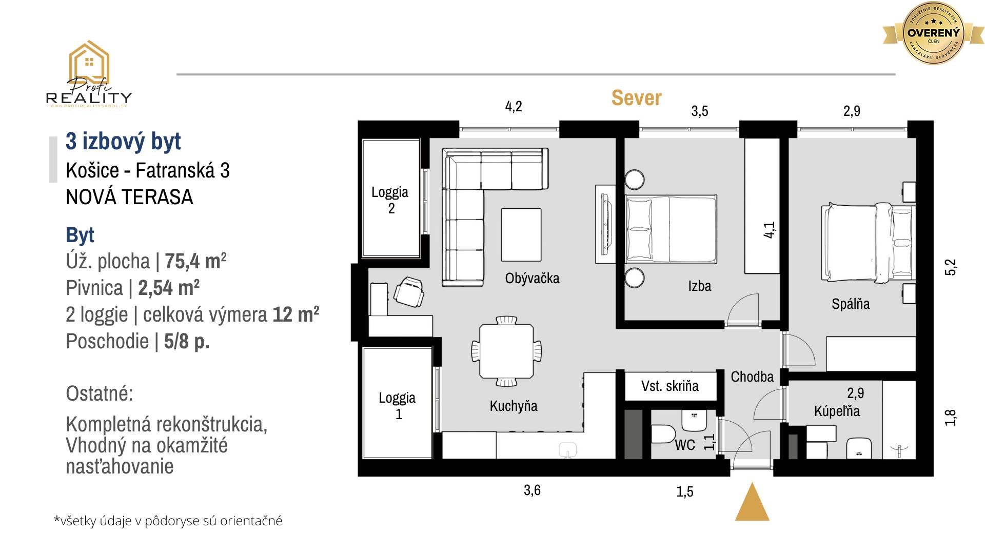 - Adresa: Fatranská 3, poschodie: 5, celková výmera podľa LV: 77,94 m² (byt: 75,4 m² + pivnica: 2,54 m²) + 2x loggia o celkovej výmere 12 m² (nezapočítané na LV)