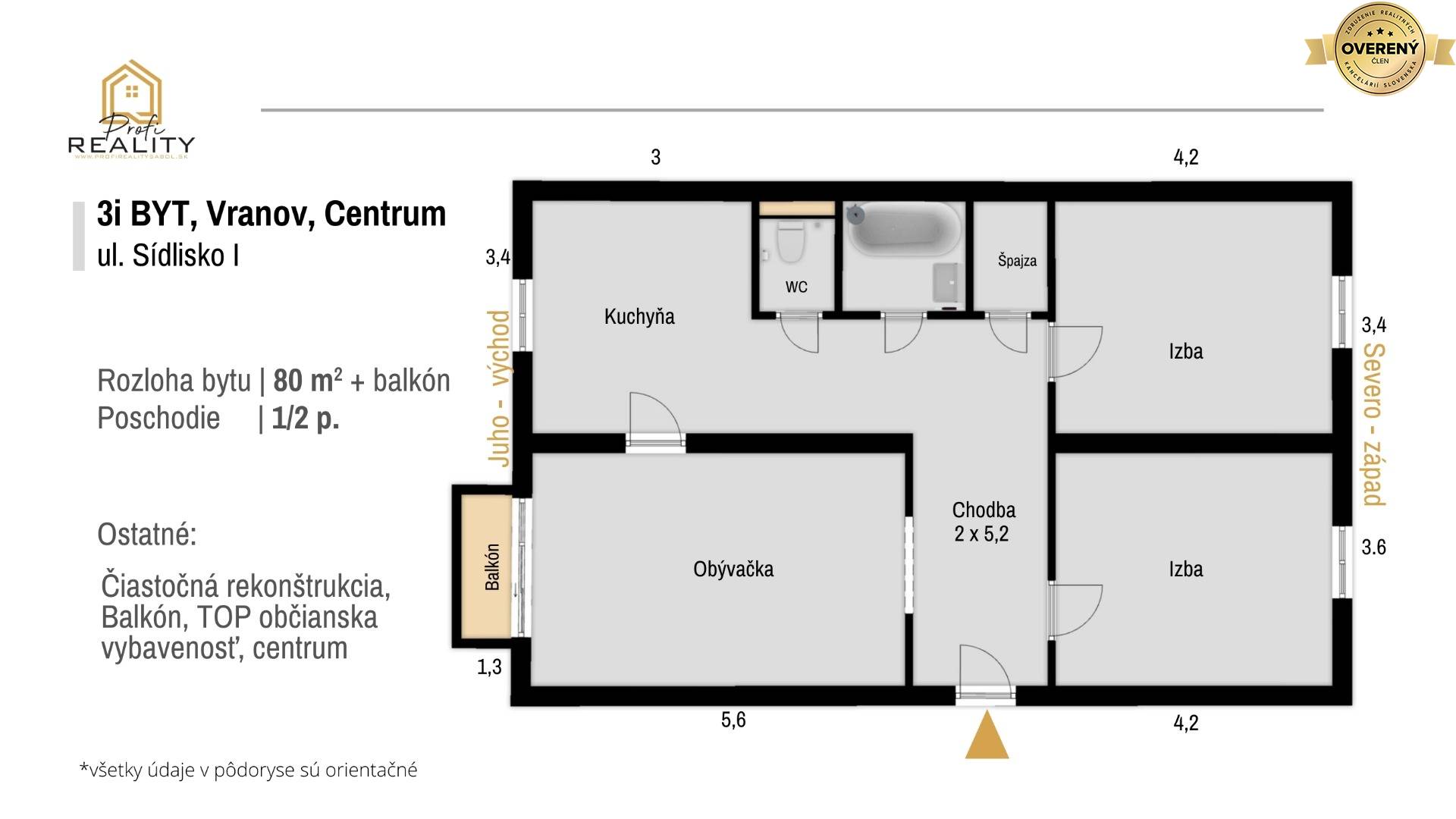 PROFI REALITY SABOL exkluzívne ponúka na predaj 3 izbový tehlový byt o rozlohe 80 m². Spolu so samostatnou priestrannou pivnicou budete vlastniť 93,92 m². Byt je kúpou okamžite voľný. Nachádza sa na prvom poschodí len dvojpodlažného bytového domu vo Vranove nad Topľou na Sídlisku I. priamo v centre mesta. Byt je vhodný na vlastné bývanie, ale aj ako investičná nehnuteľnosť na prenájom.