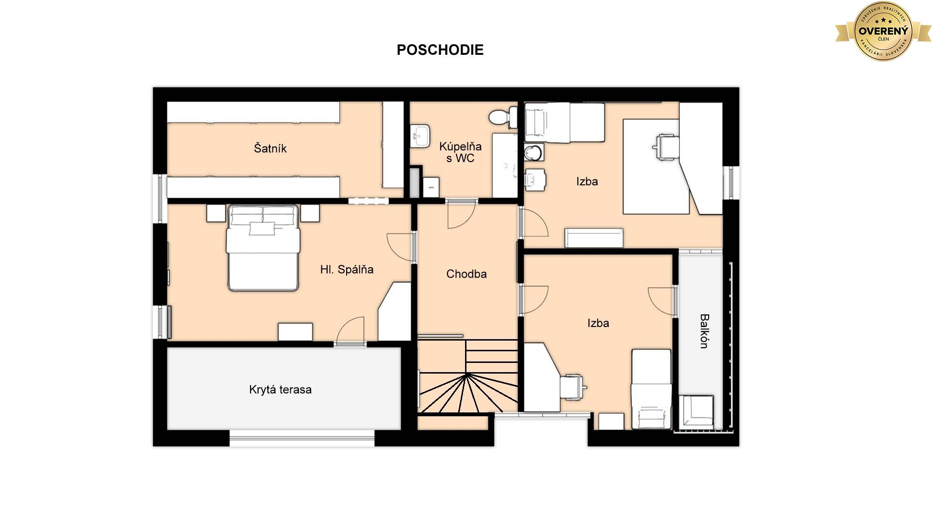 Z prízemia sa točitým oceľovým schodiskom obloženým masívom dostanete do stredu poschodia kde priamo pred Vami bude druhá kúpeľňa s WC. Vľavo sa nachádza hlavná spálňa na jednej strane so vstupom na terasu a z druhej strany spálne je vstup do veľkého šatníka.