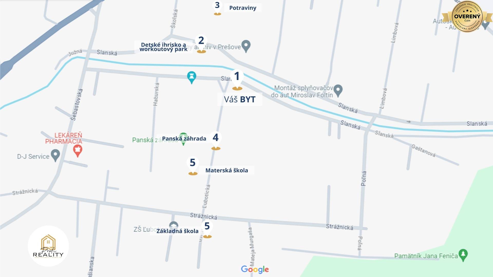 Byt sa nachádza v kompletne občiansky vybavenej lokalite na Slánskej ulici v Nižnej Šebastovej, vzdialenej len pár minút od [/b]mesta Prešov. V blízkom okolí je ZŠ, MŠ, lekár, pošta, potraviny, fitness centrum, zastávka MHD, detské ihrisko a novootvorený park Pánska záhrada, ktorá vám poskytne dostatok relaxu a oddychu.