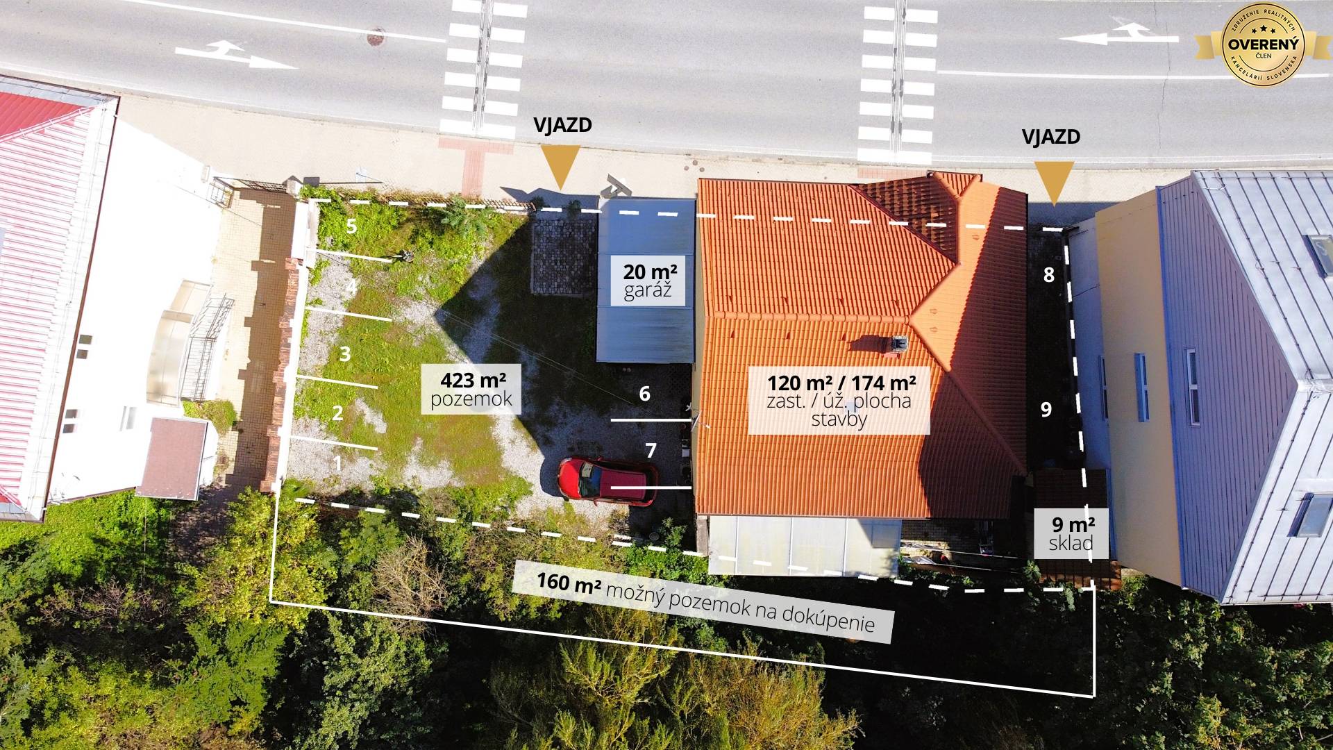 • Pozemok o rozlohe 423 m2 (celý stavebný), plocha zastavaná stavbami (zatiaľ definované ako rodinný dom + garáž) 149 m2, úžitková plocha stavieb 203 m2 (174 RD + 20 garáž + 9 sklad), stavba so začatou kvalitnou rekonštrukciou 2018 - 2020 (suterén hotový), vrátane nového kúrenia, plastových okien, hydroizolácie suterénu, internetu + TV prípojky a strešnej krytiny Bramac