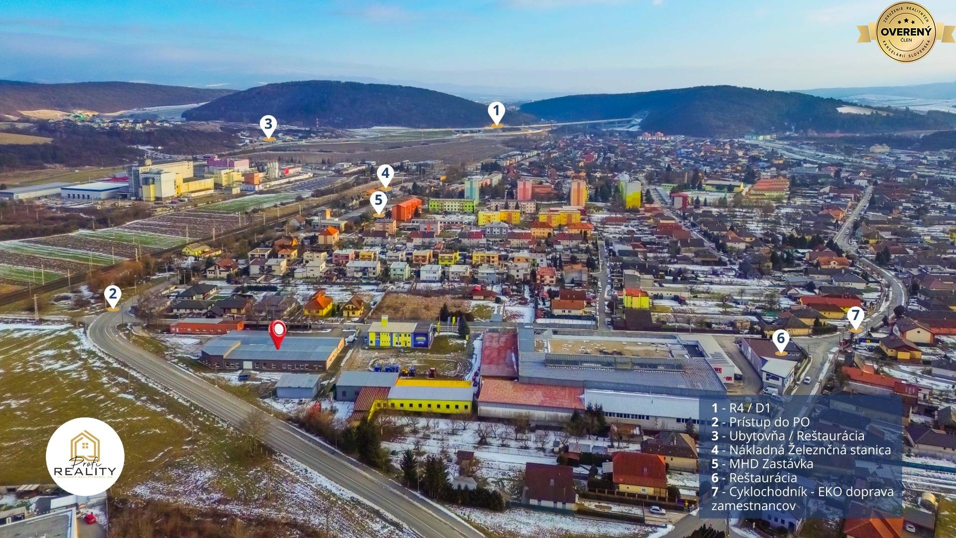 Pozemok 4763 m², úžitková plocha stavieb 1605 m², 2x Vstup do areálu aj pre kamióny, všetky siete, vlastná Trafostanica, pancierový podlaha, podvesná preprava materiálu, blízka nákladná železničná stanica a rýchlostná cesta R4 a diaľnica D1 a nízke daňové zaťaženie.